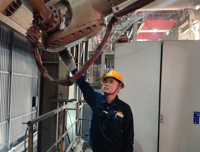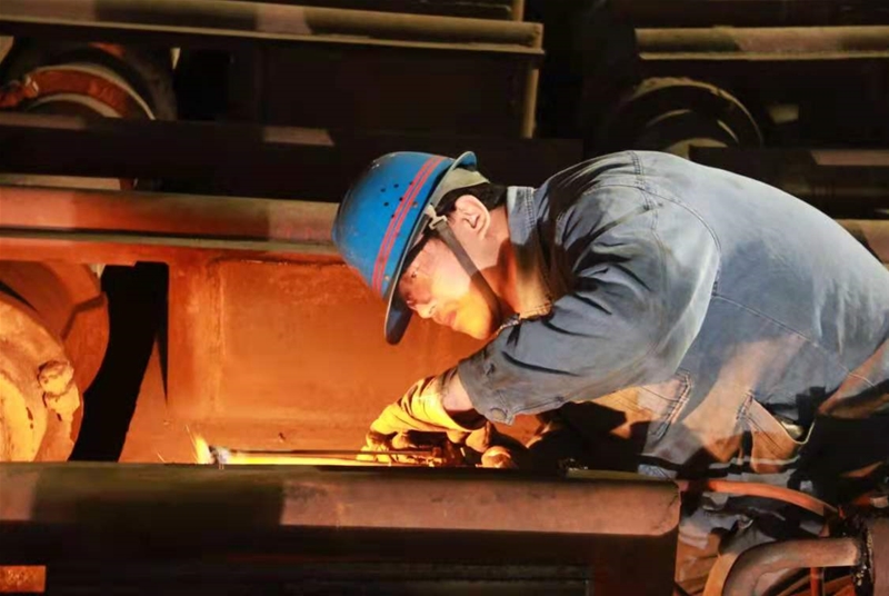 在3#轉爐爐下渣道,當爐渣的余熱還充盈在爐下每一處時,更換爐下軌道的檢修作業(yè)已經開始了。維修班長徐永斌正帶著幾位工友在拆卸渣道軌道上的連接板,由于連接板螺栓上得緊,特別難拆,幾個人用專用工具,卡在螺栓上,咬緊牙關,一毫米一毫米地拆卸著。在渣道的另一頭,維修主管趙雷和安全員高明生帶領人員正將新軌道一米一米抬過去。遠遠望去,那些“紅、黃、藍”分工協(xié)作,配合得天衣無縫。他們一個個臉上掛滿了汗珠,忍受著炙烤,但他們無暇理會這些,他們時刻在想著,在安全的保證下,一定要高效完成檢修任務,交上一份滿意答卷。