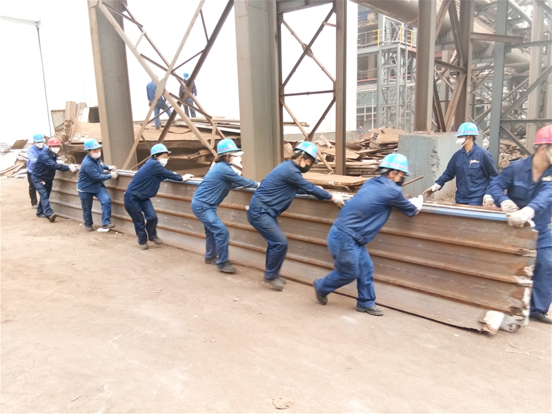 此次清理的彩鋼瓦全部為保溫類型,在上下兩層彩鋼中間夾著泡沫保溫材料,根據(jù)環(huán)保管理規(guī)定,必須將保溫材料和彩鋼分類回收處置,這就要求清理時要先將彩鋼和保溫材料分離開,意味著清理工作難度和工作量增加了好幾倍。面對困難,女工們沒有退縮,她們喊著整齊的號子,把散亂的彩鋼瓦從不同的角落拉到開闊地帶,幾個人扶著,另外幾個人慢慢的將背面的彩鋼與保溫材料剝離,接著掄起鐵锨,把剩余的保溫材料從正面的彩鋼上鏟下來,最后將彩鋼整齊的堆起來,把保溫材料用廢舊遮陽網(wǎng)包起來,等待統(tǒng)一拉運。為了盡快完成任務(wù),所有人都放棄了休息,任憑汗水浸濕了頭發(fā),順著臉頰滾落而下。