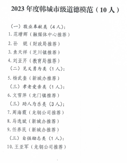 近日,韓城市2023年第三、四季度“韓城好人”和年度道德模范名單出爐。公司6名職工“榜上有名”。其中范磊磊、楊偉峰榮獲敬業(yè)奉獻類“韓城好人”,巨輝、路鵬榮獲見義勇為類“韓城好人”,周海霞榮獲助人為樂類“道德模范”,王亞軍榮獲自強勵志類“道德模范”。
