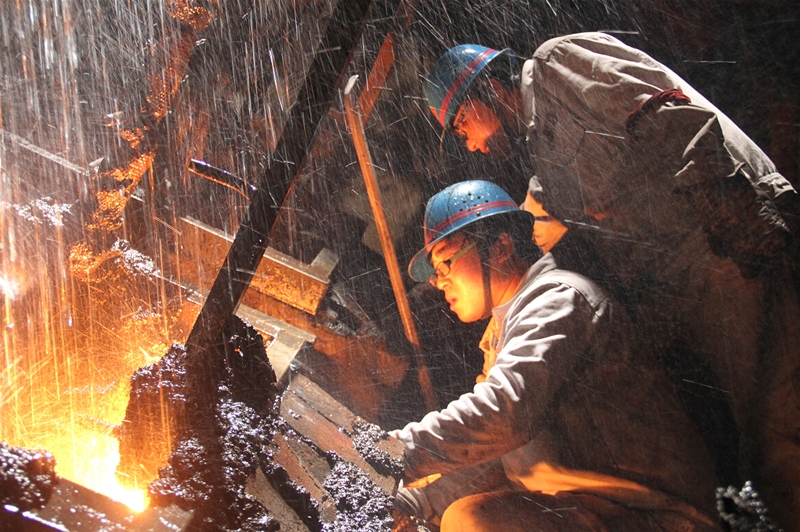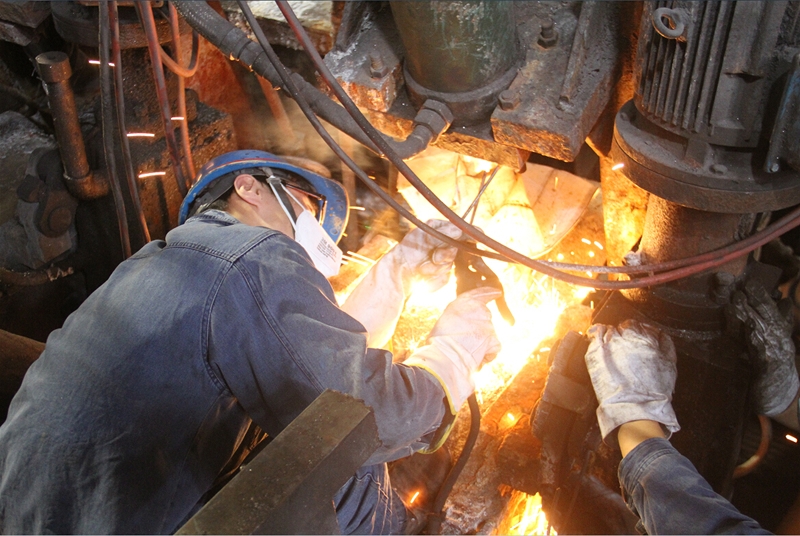 一到連鑄區(qū)域,現(xiàn)場(chǎng)緊張的檢修氣氛頓時(shí)讓我的相機(jī)也跟著緊張了起來。這邊的小張?jiān)谛堵萁z,那邊的小李不停的在向輥道下的白衣服遞扳手,拉矯機(jī)旁也是三倆成堆,有條不紊的按任務(wù)檢查設(shè)備,這時(shí)手里的相機(jī)也隨之躁動(dòng)了起來,似乎感受到了現(xiàn)場(chǎng)那個(gè)個(gè)精彩、個(gè)個(gè)重要的鏡頭,告訴自己千萬不要遺漏了哪個(gè)精彩瞬間!這時(shí),鏡頭里的一個(gè)身影讓我立刻緊張了起來,盡管我叫不上他的名字,然而在他的手中,焊槍已然成為了他最有力的戰(zhàn)斗工具,飛舞的焊花在他手中是那樣的美麗,透過鏡頭可以清晰看到,他額頭的汗珠一滴一滴的往下流,腳下的廢渣還在不停的冒著白煙,然而他的眼神依舊還是那樣的犀利,緊緊的盯著焊縫,一動(dòng)不動(dòng)……
