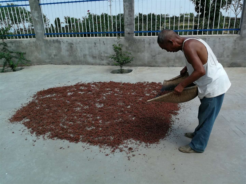 中午吃飯的時候,爺爺就不見了,只聽見院子里“嚓嚓嚓”的聲音,隨即我來到院子里看見爺爺在收花椒,摸了摸花椒還沒干就問爺爺:“爺爺,花椒還沒曬干怎么就收了。”爺爺說道:“這曬花椒不能曬的太干了,太干了花椒就碎了,不好脫籽”說著爺爺已經(jīng)將花椒掃成一堆,用木扒將花椒輕輕地拍打,使花椒籽從花椒上脫離出來,隨后將大部分花椒用木扒扒出來晾曬,剩下的花椒和籽混在一起不好分離,這時候爺爺就用簸箕將花椒和籽用他的多年技術(shù)給分離出來??粗鵂敔敻傻暮貌粺狒[我也試著干了一會,發(fā)現(xiàn)花椒粒沒有從花椒籽里分出來,它們還是混在一起,看來這個活還得慢慢積累經(jīng)驗。