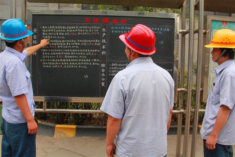 為了更醒目的展現(xiàn)對違章事實、所在單位、所屬專業(yè)和管理人員的處罰,從視覺上提高各級人員對“五化”曝光問題的關(guān)注度,有效杜絕同類問題的重復(fù)出現(xiàn)。近期,設(shè)備管理中心對五化曝光欄進(jìn)行了劃線、標(biāo)識,分區(qū)域、分專業(yè)用粉筆的不同顏色對問題進(jìn)行曝光,突出違章人員姓名和違章考核結(jié)果,充分運(yùn)用色彩管理將管理者的“面子”、“票子”曝光。